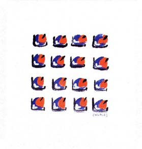 ![]() Chantal Morillon, gouache sur crêpe de chine, 2003 Voilà l'impression qu'une grâce couturière, lassée des grands festins de robes (petite main), laisserait sur ses échantillons de soie, non de l'aiguille mais à la larme douce du pinceau. Portée d'ocelles, miettes d'agates, plumes, pétales, œils-de-chat et de tigre dont on retient un état de nature semblable à ces jardins miniatures plus vrais que leur vaste modèle.