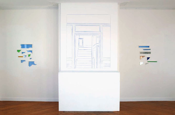 * Christophe Cuzin, à l'aide d'un miroir, dessine au cordon traceur, sur le cache-miroir la montée de l'escalier qui se trouve en vis à vis. (le vrai miroir du salon se trouve en dessous). A participé aux expositions : site web perso : www.pierreburaglio.com |